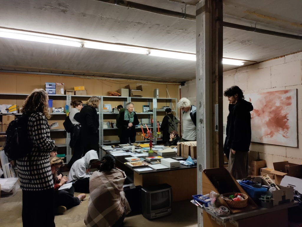 In het kader van een nieuwe onderzoeksgroep Hybrid Arts Lab ontvingen we een groep studenten van kunstacademie Minerva. Na inleidende gesprekken en een rondleiding met toelichting was er gelegenheid om de kunstcollectie en publicaties individueel te bekijken. Hier werd meteen uitstekend gebruik van gemaakt. Een vervolg, met de nadruk op transdisciplinaire praktijk, onderzoek en archivering, is in de maak. Met dank aan begeleiders Barthold Boksem en Hille Engelsma.